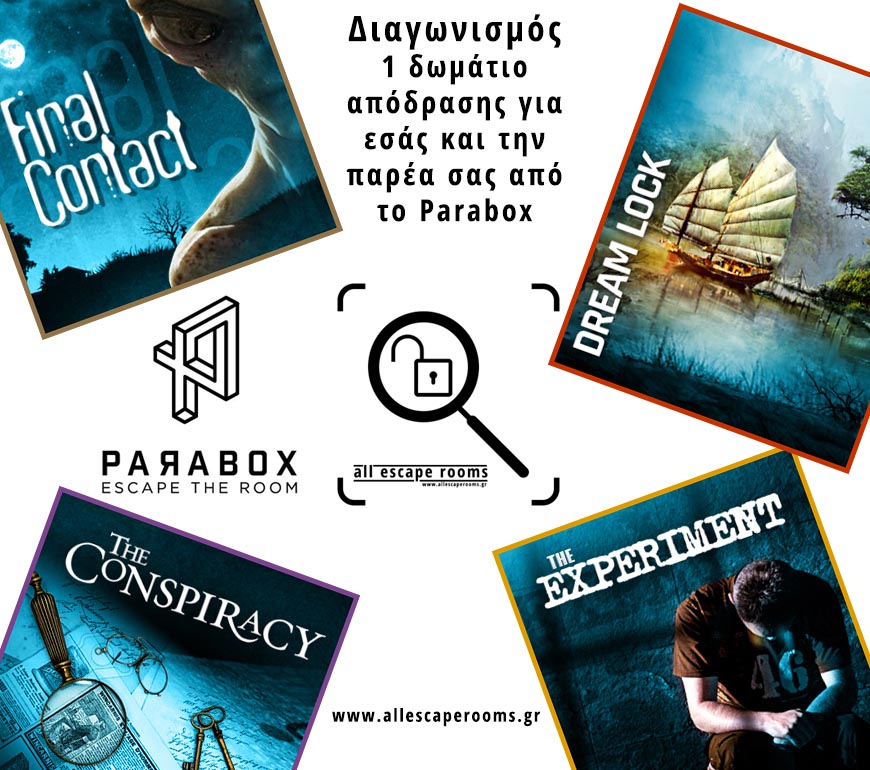 To allescaperooms.gr διοργανώνει διαγωνισμό και σας δίνει τη δυνατότητα να κερδίσετε μία συμμετοχή για εσάς και την παρέα σας για ένα δωμάτιο απόδρασης του Parabox!