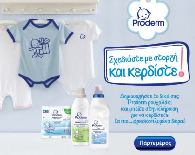 Η Proderm Greece διοργανώνει διαγωνισμό μέσω facebook. Mε τη διαδικασία της κλήρωσης ανάμεσα σε όλους τους συμμετέχοντες που έχουν δημιουργήσει το δικό τους Proderm ρουχαλάκι, 5 τυχεροί θα κερδίσουν σετ απορρυπαντικών Proderm για ένα χρόνο, 25 τυχεροί θα κερδίσουν το φορμάκι που σχεδίασαν, 25 τυχεροί θα κερδίσουν από ένα μπουρνούζι και 50 τυχεροί θα κερδίσουν από ένα wash glove Proderm