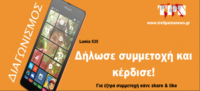 Το trelipareanews.gr χαρίζει σε ένα τυχερό νικήτη ένα κινητό Microsoft Lumia 535, με λειτουργικό Windows 8.1, διπλή SIM για συνδυασμό επαγγελματικών και προσωπικών επαφών σε μια συσκευή αλλά και οθόνη 5″ gorilla glass που κάνει ακόμα καλύτερη την εμπειρία Windows.