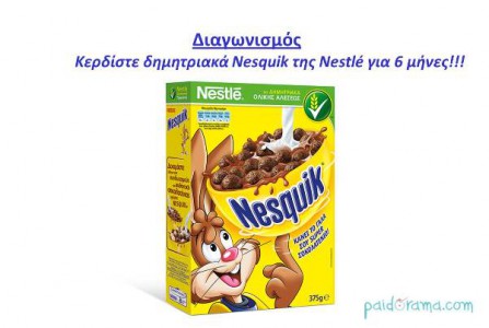 Το Paidorama.com σε συνεργασία με τη Nestlé κάνουν δώρο σε 3 τυχερές μανούλες τα αγαπημένα δημητριακά Nesquik του παιδιού τους για 6 μήνες! Ο διαγωνισμός μας τελειώνει την Κυριακή 5 Απριλίου. Καλή επιτυχία!