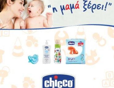 Η Chicco Greece διοργανώνει διαγωνισμό και σας δίνει τη δυνατότητα να κερδίσετε τα προϊόντα που επιθυμείτε: 4 γυάλινα μπιμπερό, για τους νικητές της κατηγορίας των μπιμπερών, από 4 πιπίλες από σιλικόνη σε χρώμα ροζ ή σιελ, για τους νικητές της κατηγορίας πιπίλα, από 2 αφρόλουτρα-σαμπουάν, για τους νικητές από τη κατηγορία Αφρόλουτρο-Σαμπουάν, από 2 συσκευασίες πάνας νούμερο 5 (κιλά 12-15),για τους νικητές από τη κατηγορία Πάνες.