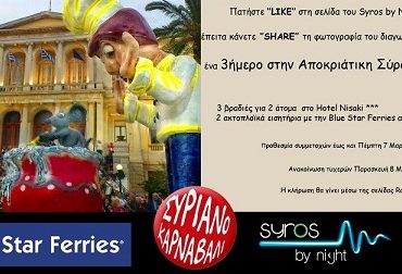 Η σελίδα Syros by Night διοργανώνει διαγωνισμό και σας δίνει τη δυνατότητα να κερδίσετε 1 τριήμερο στην Αποκριάτικη Σύρο 15-18 Μαρτίου με πληρωμένα εισιτήρια και διαμονή.