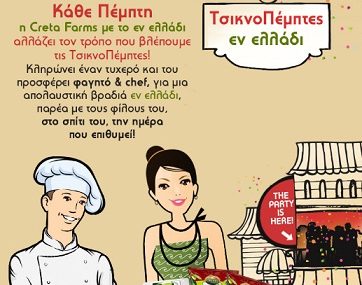 Η Creta Farms σου ετοιμάζει πάρτι, προσφέροντας φαγητό, chef και σέρβις! Διεκδίκησε να είσαι ο τυχερός αυτής της εβδομάδας δηλώνοντας συμμετοχή για την εβδομαδιαία κλήρωση μέσα από την εφαρμογή «ΤσικνοΠέμπτες εν ελλάδι»!