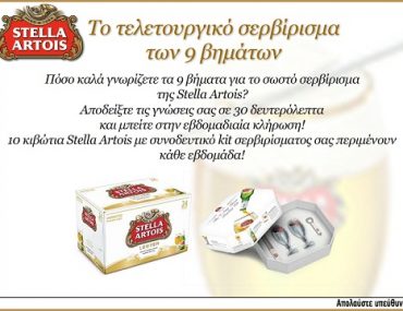 Η Stella Artois διοργανώνει διαγωνισμό και σας δίνει τη δυνατότητα να κερδίσετε 10 κιβώτια Stella Artois με συνοδευτικό kit σερβιρίσματος κάθε εβδομάδα.