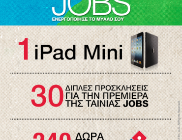 Η σελίδα Domino’s Pizza Greece διοργανώνει διαγωνισμό και σας δίνει τη δυνατότητα να κερδίσετε 30 διπλές προσκλήσεις για την πρεμιέρα της ταινίας Jobs και ένα iPadMini για το μεγάλο νικητή! Επιπλέον οι πρώτοι 10 χρήστες που απαντούν σωστά σε ένα γύρο θα κερδίζουν δώρα από τη Domino.