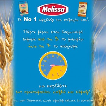 Η Melissa διοργανώνει διαγωνισμό και δίνει τη δυνατότητα σε 2 νικητές της κάθε ημέρας διαγωνισμού (συνολικά θα γίνουν 6 κληρώσεις) να κερδίσουν: Ο πρώτος τυχερός 3 συσκευασίες χοντρό σιμιγδάλι Melissa, 1 φόρμα για χαλβά, 1 ξύλινη κουτάλα και 1 ζυγαριά ζαχαροπλαστικής, ενώ ο δεύτερος 3 συσκευασίες ψιλό σιμιγδάλι Melissa, 1 πυρέξ για σάμαλι, 1 ξύλινη κουτάλα και 1 ζυγαριά ζαχαροπλαστικής.