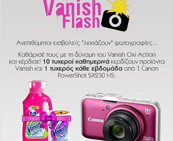 Η σελίδα Vanish διοργανώνει διαγωνισμό και δίνει τη δυνατότητα σε 10 τυχερούς κάθε ημέρα να κερδίσουν από 1 Vanish Power White Σκόνη 500gr και 1 Vanish Extra Hygiene Gel 940mL και σε 1 τυχερό κάθε εβδομάδα να κερδίσει 1 φωτογραφική μηχανή Canon PowerShot SX230 HS.