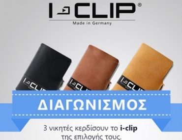Το i-clip.gr διοργανώνει διαγωνισμό και δίνει τη δυνατότητα σε 3 τυχερούς να κερδίσουν από ένα μινιμαλιστικό i-clip στο χρώμα τις επιλογής τους για να μεταφέρουν έως 12 κάρτες & χρήματα, απλά, διακριτικά και κομψά!