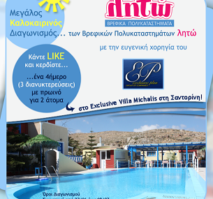 Τα Βρεφικά Πολυκαταστήματα ΛΗΤΩ διοργανώνουν διαγωνισμό και σας δίνουν τη δυνατότητα να κερδίσετε ένα τετραήμερο (τρείς διανυκτερεύσεις) στο ξενοδοχείο Exclusive Villa Michalis στη Βλυχάδα Σαντορίνης σε standard δίκλινο με πρωινό, προσφορά της Exclusive Plan Group of Companies.