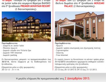 Το epiloges.gr διοργανώνει διαγωνισμό και σας δίνει τη δυνατότητα να κερδίσετε 4 τριήμερα για 2 άτομα σε junior suite στο Premier Mountain Resort (Bansko) και 2 τριήμερα για 2 άτομα σε δίκλινο δωμάτιο στο 4* ξενοδοχείο Mouzaki Palace!