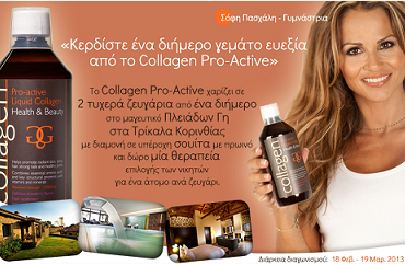 Η σελίδα Drink Collagen for Health & Beauty διοργανώνει διαγωνισμό και σας δίνει τη δυνατότητα να κερδίσετε 2 μαγευτικά διήμερα για δύο υπερτυχερά ζευγάρια, γεμάτα υγεία και ευεξία, στο μαγευτικό “Πλειάδων Γη – Mountain Resort & Spa” στα Τρίκαλα Κορινθίας.