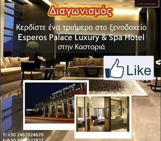 Το dailyout.gr διοργανώνει διαγωνισμό και σας δίνει τη δυνατότητα να κερδίσετε 2 διανυκτερεύσεις στο Esperos Palace Luxury & Spa Hotel στην Καστοριά, σε δίκλινο δωμάτιο και πλούσιο πρωινό μπουφέ στο κεντρικό εστιάτοριο ATRIUM.