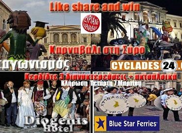 Το cyclades24.gr διοργανώνει διαγωνισμό και σας δίνει τη δυνατότητα να κερδίσετε 1 τριήμερο στο Καρναβάλι στη Σύρο, 15-18 Μαρτίου που θα περιλαμβάνει εισιτήρια (Blue star) και διαμονή για 2 άτομα στο Ξενοδοχείο Διογένης.