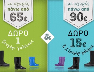 Τo Σαββατοκύριακο 23-24 Νοεμβρίου το myshoe.gr προσφέρει 2 μοναδικά δώρα, ως εξής: Δώρο ένα ζευγάρι γαλότσες για αγορές άνω των 65€ και Δώρο 15€ έκπτωση και ένα ζευγάρι γαλότσες για αγορές άνω των 90€.