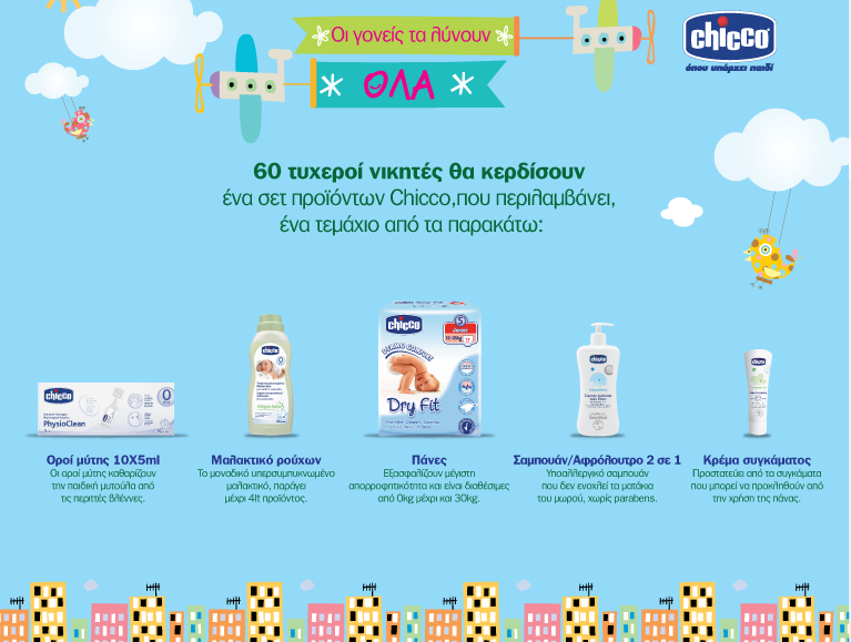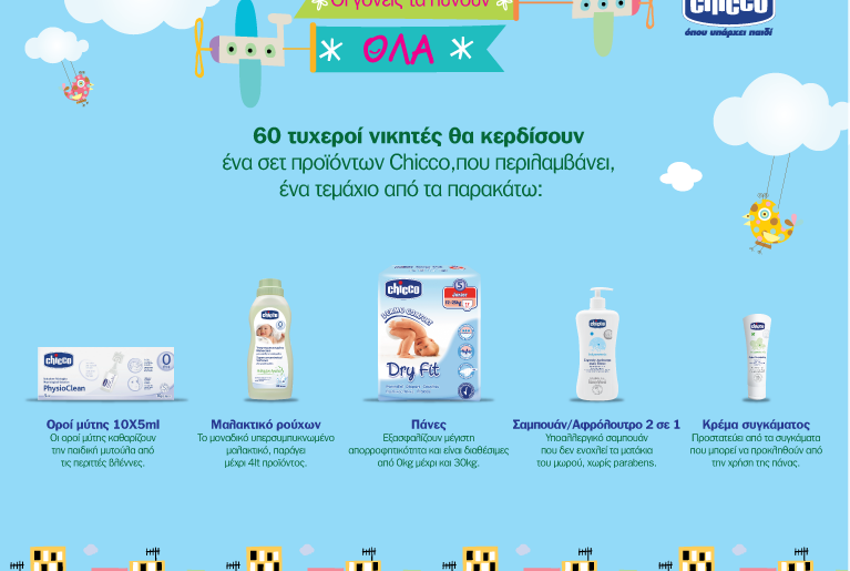 Το Chicco διοργανώνει διαγωνισμό και σας δίνει τη δυνατότητα να κερδίσετε 60 σετ προϊόντων της Εταιρείας. Πιο συγκεκριμένα, θα κερδίσετε τα εξής προϊόντα: