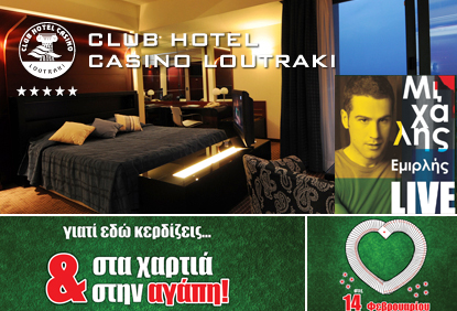 Το WinWinDeals.gr σε συνεργασία με το 5 αστέρων Club Hotel Casino Loutraki διοργανώνουν προσφορά και σας προσφέρουν 1 VIP διανυκτέρευση 2 ατόμων, σε dοuble room για τις ημέρες 13/2 και 14/2, welcome στο δωμάτιο με σαμπάνια και σοκολατάκια, πρωινό και spa με μόλις 69€ (Αξίας 220€ – Κερδίζετε 131€)