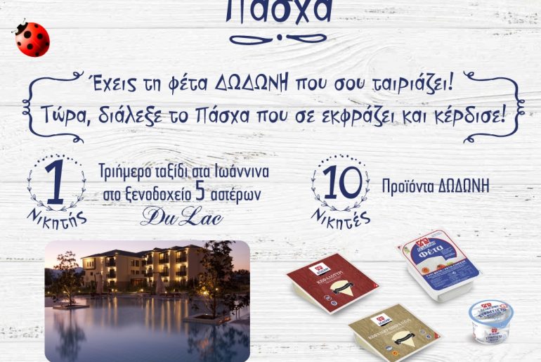 Η Δωδώνη διοργανώνει διαγωνισμό και δίνει τη δυνατότητα σε 11 τυχερούς να κερδίσουν ένα τριήμερο στο ξενοδοχείο 5 αστέρων Du Lac Congress Center & SPA, στα Ιωάννινα, σε δίκλινο δωμάτιο με πρωινό (μέχρι και 15 Δεκεμβρίου 2017 εκτός περίοδων συνεδρίων, εκδηλώσεων, Αργιών και Εορτών) και 10 πακέτα με προϊόντα που περιλαμβάνουν: