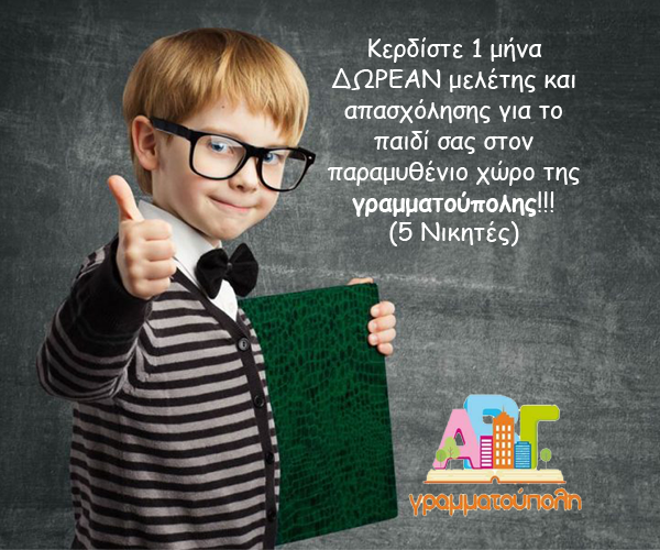 Η Γραμματούπολη διοργανώνει διαγωνισμό και δίνει τη δυνατότητα σε 5 τυχερούς να κερδίσουν ένα μήνα μελέτης και απασχόλησης για τα παιδιά τους! Με τους εξειδικευμένους παιδαγωγούς το κάθε παιδί (Δημοτικού ή Γυμνασίου) περνάει το χρόνο του δημιουργικά και μαθαίνει να οργανώνει και να προγραμματίζει το διάβασμά του μεθοδικά και με ευχαρίστηση!