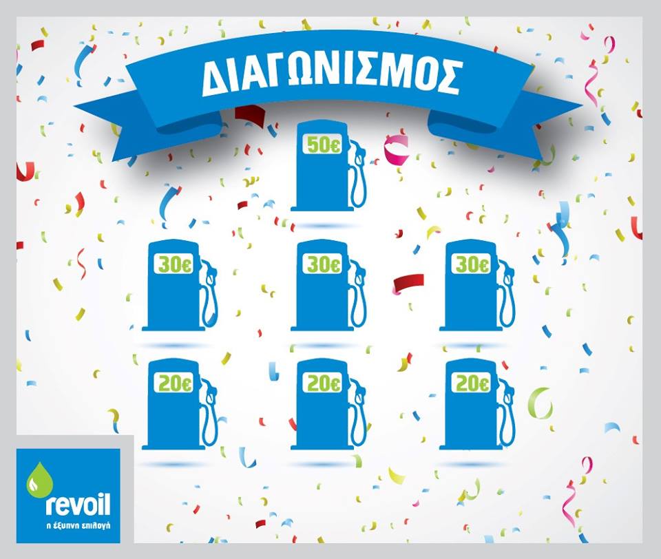 H Revoil διοργανώνει διαγωνισμό και δίνει τη δυνατότητα σε ένα μεγάλο τυχερό να κερδίσει καύσιμα αξίας 50 €, 3 τυχεροί κερδίζουν καύσιμα αξίας 30€ και 3 τυχεροί 20€ έκαστος!