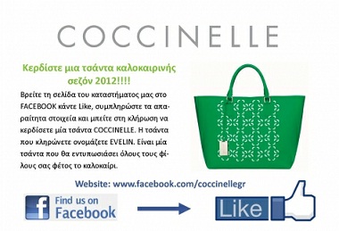 Η σελίδα COCCINELLE ATHENS GREECE Retail Shop διοργανώνει διαγωνισμό και σας δίνει τη δυνατότητα να κερδίσετε μια τσάντα EVELIN, της καλοκαιρινής σεζόν 2012.