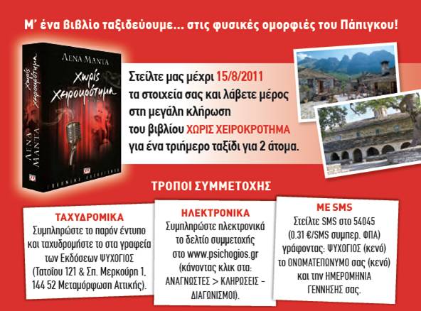 Στείλτε μας μέχρι 15/8/2011 τα στοιχεία σας και λάβετε μέρος στη μεγάλη κλήρωση του βιβλίου ΧΩΡΙΣ ΧΕΙΡΟΚΡΟΤΗΜΑ για ένα τριήμερο ταξίδι για 2 άτομα στο Πάπιγκο. Συμμετοχή εδώ