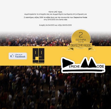 Το 123PlayGames διοργανώνει διαγωνισμό και σας δίνει τη δυνατότητα να κερδίσετε 2 εισιτήρια για την συναυλία των Depeche Mode στο Terra Vibe στη Μαλακάσα, αξίας 50€ το κάθε ένα.