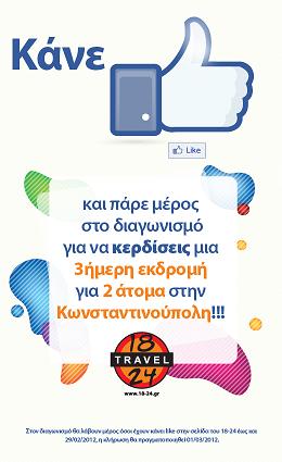 Το 18-24 Travel διοργανώνει διαγωνισμό και δίνει τη δυνατότητα σε όσους κάνουν like στη σελίδα του στο facebook να κερδίσουν μια 3ήμερη εκδρομή για 2 άτομα στην Κωσταντινούπολη.