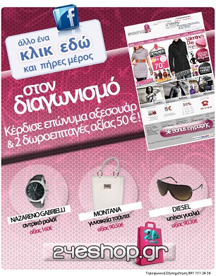 Το 24ESHOP.GR διοργανώνει διαγωνισμό και σας δίνει τη δυνατότητα να κερδίσετε 1 ανδρικό ρολόϊ ΝAZARENO GABRIELLI αξίας 160€, 1 γυναικεία τσάντα ΜΟΝΤΑΝΑ αξίας 90,50€, 1 unisex ζευγ. γυαλιά DIESEL αξίας 90,30€ και 2 δωροεπιταγές αξίας 50 € (έκαστη).