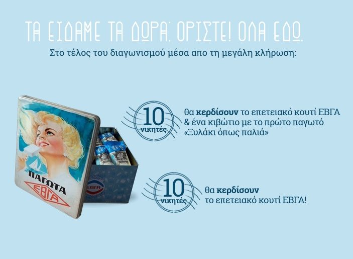 Η ΕΒΓΑ διοργανώνει διαγωνισμό και σας δίνει τη δυνατότητα να κερδίσετε σε 10 τυχερούς να κερδίσουν το επετειακό κουτί ΕΒΓΑ & ένα κιβώτιο με το πρώτο παγωτό «Ξυλάκι όπως παλιά»