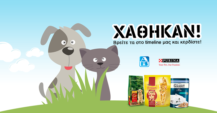 Ένα σκυλάκι και μία γάτα χάθηκαν κάπου στο timeline του ΑΒ Βασιλόπουλος! Βρείτε τα μέχρι την Παρασκευή 10/10, αφήστε το σχόλιό σας στην κρυψώνα τους και κερδίστε δώρα για τον δικό σας σκύλο ή γάτα! Αναλυτικότερα τα σετ θε περιλαμβάνουν τα ακόλουθα προϊόντα: Προϊόντα για γάτες: 3 τεμ. Friskies Crock & Soft Βοδινό 400g 1 κιβώτιο Gourmet Perle( 85g) Προϊόντα για σκύλους: 1 κιβώτιο Friskies Nutri Soft Βοδινό 6×1.5Kg