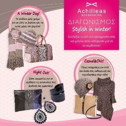 Η σελίδα Achilleas Accessories διοργανώνει διαγωνισμό και σας δίνει τη δυνατότητα να κερδίσετε το σετ της προτίμησής σας, από τις τρεις fashionable επιλογές: A WINTER DAY, CASUAL&CHIC και NIGHT OUT.