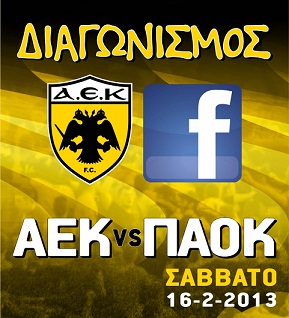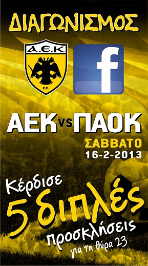 Η AEK FC διοργανώνει διαγωνισμό και δίνει τη δυνατότητα σε 5 νικητές να κερδίσουν διπλές προσκλήσεις για τον εντός έδρας αγώνα που θα διεξαχθεί το Σάββατο 16/2/2013 ΑΕΚ – ΠΑΟΚ.