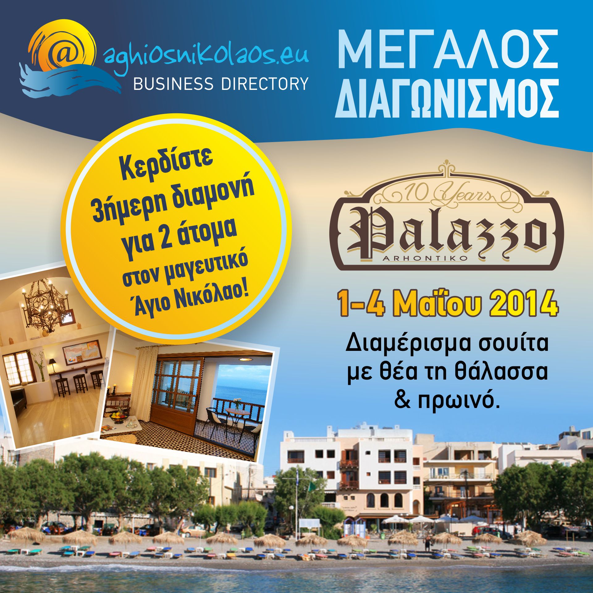 Η σελίδα aghiosnikolaos.eu διοργανώνει διαγωνισμό και σας δίνει τη δυνατότητα να κερδίσετε 3ήμερη διαμονή σε σουίτα στο Palazzo Arhontiko Apartments!