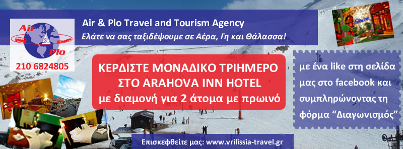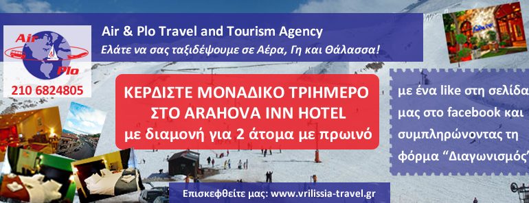 Το Air & Plo Travel διοργανώνει διαγωνισμό και σας δίνει τη δυνατότητα να κερδίσετε ένα τριήμερο στην Αράχωβα, στο ARAHOVA INN με πρωινό για 2 άτομα σε δίκλινο δωμάτιο, για το τριήμερο της 25ης Μαρτίου.