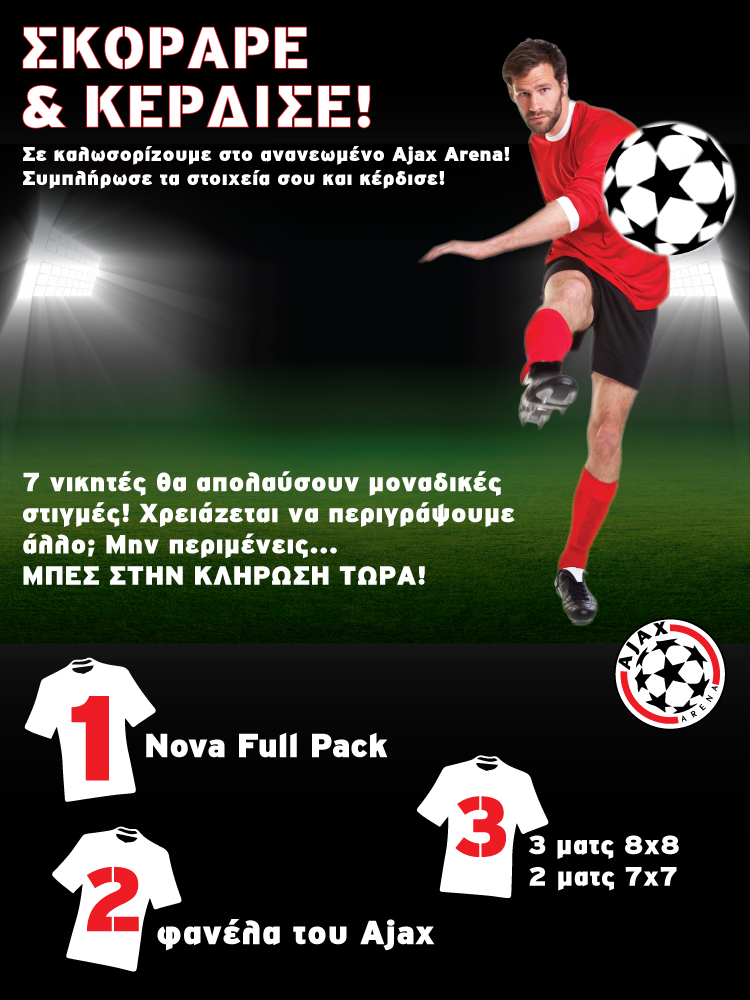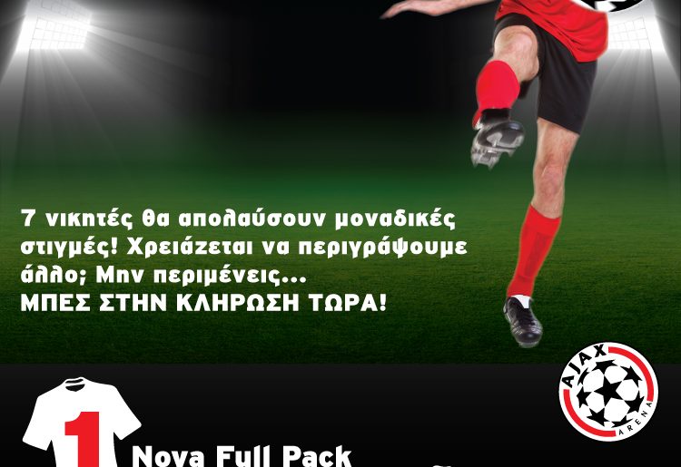 Το Ajax Arena διοργανώνει διαγωνισμό και σας δίνει τη δυνατότητα να κερδίσετε ένα NOVA FULL PACK, μία φανέλα AJAX και 5 αγώνες σε γήπεδο 8×8, αξίας 440 ευρώ!