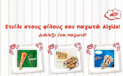 Η Algida διοργανώνει διαγωνισμό και σας δίνει τη δυνατότητα να κερδίσετε 1 καταψύκτη “Algida” (τύπου EKTOR 16, χωρητικότητας 172lt, διαστάσεων εξωτερικών: μ * π * υ = 654 x 644 x 899 mm), 1 κιβώτιο Magic Infinity, 1 κιβώτιο Μagic Classic, 1 κιβώτιο Magic Πύραυλος, 1 κιβώτιο Magic White, 1 κιβώτιο Cornetto Classico, 1 κιβώτιο Cornetto Enigma Cookie, 1 κιβώτιο Cornetto Enigma Σοκολάτα-Καραμέλα, 1 κιβώτιο Cornetto Devils & Angels, 1 κιβώτιο My Carte D’Or Τριπλή σοκολάτα, 1 κιβώτιο 0%, 1 κιβώτιο Solero, 1 κιβώτιο Calippo Φράουλα & Tροπικά Φρούτα.