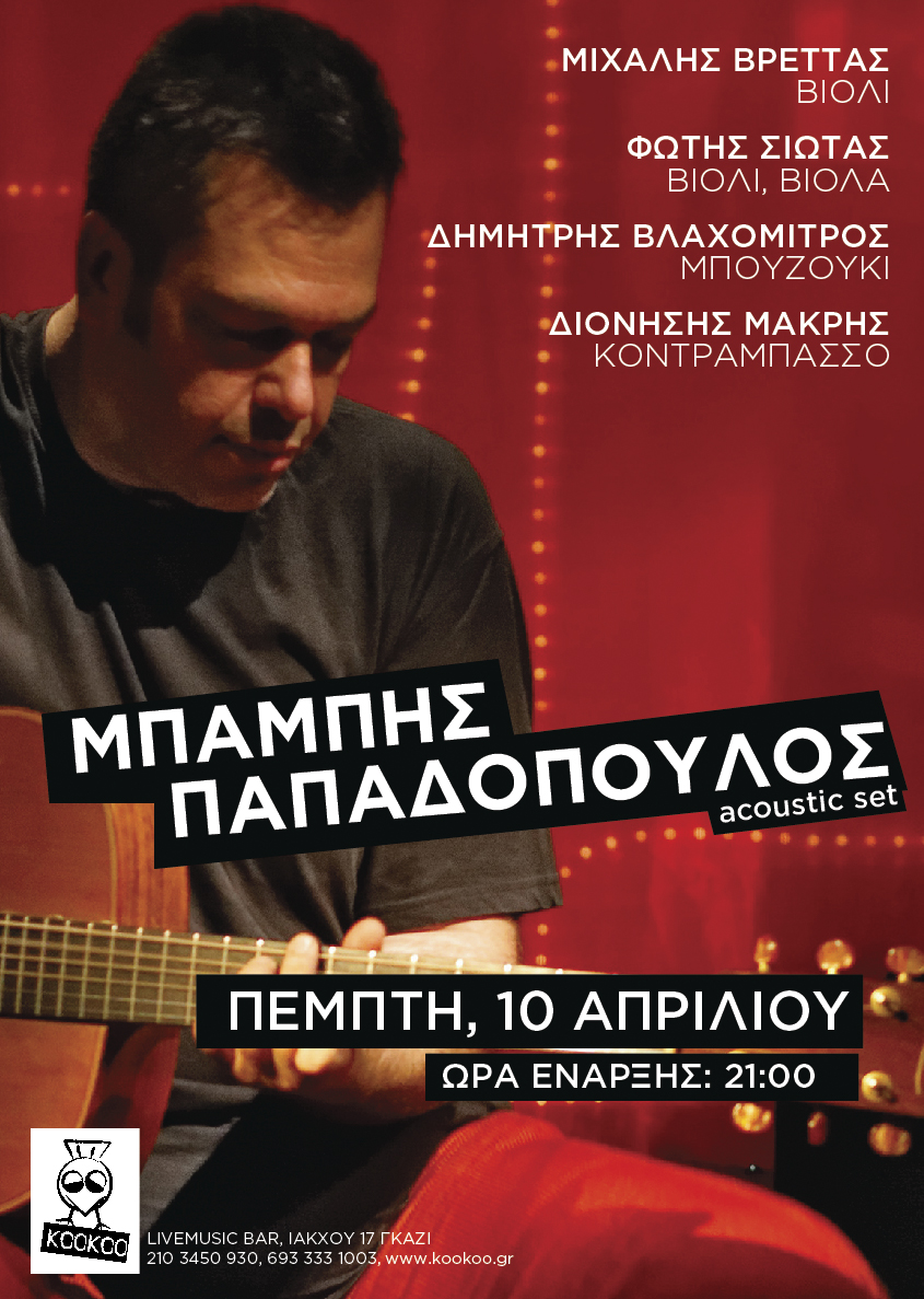 Το allaboutmusic.gr διοργανώνει διαγωνισμό και σας δίνει τη δυνατότητα να κερδίσετε 3 διπλές προσκλήσεις για τον Μπάμπη Παπαδόπουλο στο KooKoo Music Bar την Πέμπτη 10 Απριλίου 2014.