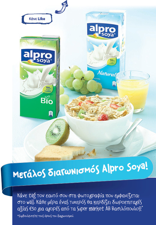 Η Alpro Soya διοργανώνει διαγωνισμό στο facebook και σας δίνει τη δυνατότητα να κερδίσετε καθημερινά από μία δωροεπιταγή αξίας 50€ για αγορές από τα Super Market AB Βασιλόπουλος!