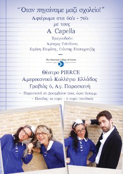 Το free press περιοδικό Alter Vita σε συνεργασία με το ΑΜΕΡΙΚΑΝΙΚΟ ΚΟΛΛΕΓΙΟ ΕΛΛΑΔΟΣ διοργανώνει διαγωνισμό και σας δίνει τη δυνατότητα να κερδίσετε 5 διπλές προσκλήσεις για τη μουσική βραδιά “Όταν πηγαίναμε μαζί σχολειό” με τα πιο αγαπημένα ελληνικά και ξένα τραγούδια των 60’s και των 70’s, με τους A Capella την Παρασκευή 16 Δεκεμβρίου 2011.