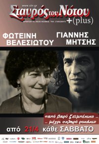 Το Free Press περιοδικό ALTER VITA σε συνεργασία με τον ΣΤΑΥΡΟ ΤΟΥ ΝΟΤΟΥ εξασφάλισε για εσάς, δύο διπλές προσκλήσεις για Σάββατο 5 Μαΐου για την εμφάνιση των Φωτεινής Βελεσιώτου και Γιάννη Μήτση στο Σταυρό του Νότου PLUS.
