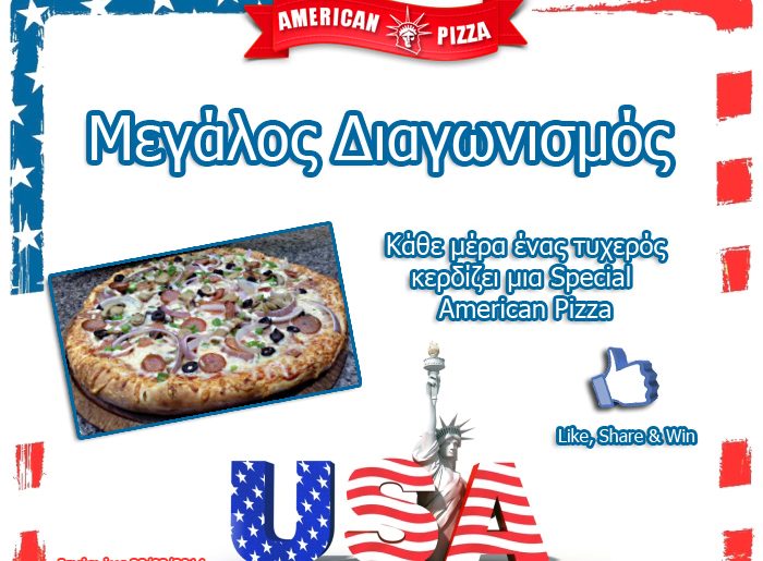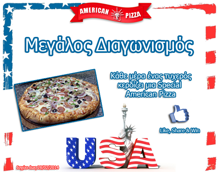 Η American Pizza Lamias διοργανώνει διαγωνισμό και δίνει τη δυνατότητα κάθε μέρα σε ένα τυχερό να κερδίσει μια Special American Pizza (ισχύει για όλο τον Μήνα Φεβρουάριο).