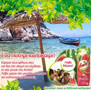 Η Amita διοργανώνει διαγωνισμό και δίνει τη δυνατότητα σε 50 τυχερούς να κερδίσουν από ένα κιβώτιο Amita Κοκτέιλ Καρπούζι (το κάθε κιβώτιο περιέχει 12 συσκευασίες 1LT) και σε ένα μεγάλο νικητή να κερδίσει 2 διανυκτερεύσεις για 2 άτομα ή για τετραμελή οικογένεια σε ένα Grecotel της επιλογής του.
