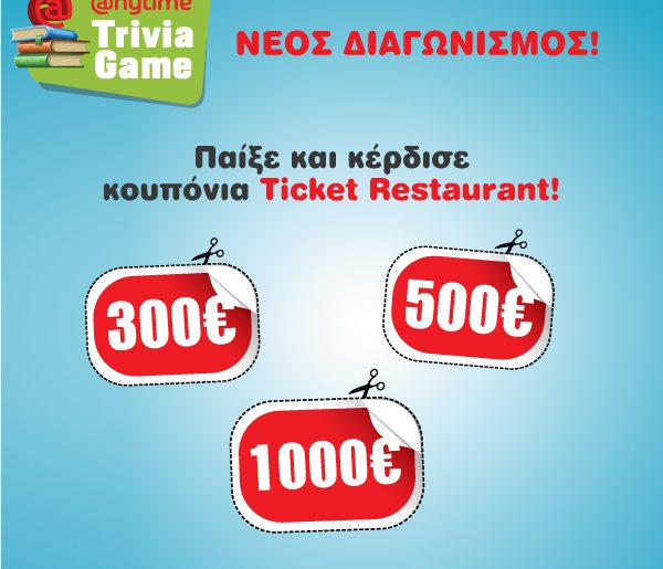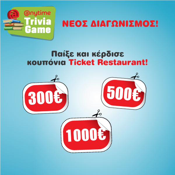 Η Anytime Online σας καλεί στο «ANYTIME TRIVIA GAME» και σας δίνει τη δυνατότητα να κερδίσετε καθημερινά κουπόνια Ticket Restaurant αξίας 300€ ενώ στο τέλος του παιχνιδιού 1 τυχερός θα κερδίσει 500€ και άλλος ένας 1000€.