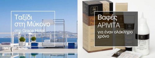 Η Apivita διοργανώνει διαγωνισμό και σας δίνει τη δυνατότητα να κερδίσετε 3 διανυκτερεύσεις με πρωινό για δύο άτομα σε κατηγορία δωματίου Deluxe Room στο ξενοδοχείο Grace Mykonos Hotel (1ος νικητής) και βαφές APIVITA για 1 ολόκληρο χρόνο (για 12 νικητές).
