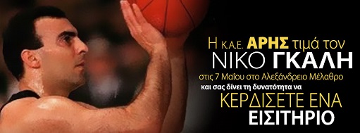 Η Κ.Α.Ε. ΑΡΗΣ διοργανώνει διαγωνισμό μέσω της επίσημης σελίδας της στο Facebook και 5 τυχεροί φίλαθλοι μπορούν να κερδίσουν εισιτήρια για την τιμητική εκδήλωση του Νίκου Γκάλη που θα πραγματοποιηθεί στις 7 Μαΐου στο Αλεξάνδρειο Αθλητικό Μέλαθρο Θεσσαλονίκης.