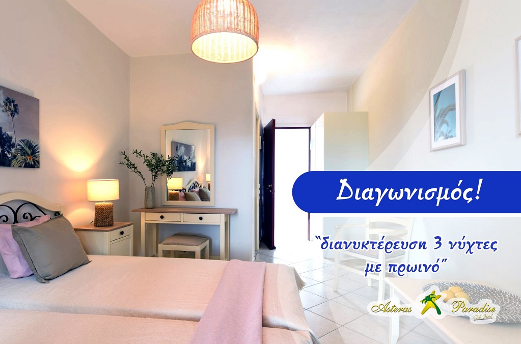 Το Asteras Paradise Clubhotel στην Πάρο διοργανώνει διαγωνισμό και σας δίνει τη δυνατότητα να κερδίσετε 3 διανυκτερεύσεις σε δίκλινο δωμάτιο με πρωινό!