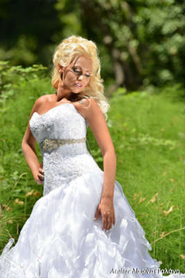 Το νυφικό φόρεμα είναι από τη νέα συλλογή 2014 του Ατελιέ Μαρίνα Γαλάνη. Ένα νυφικό από μεταξωτά υφάσματα και κεντημένη δαντέλα από κρύσταλλα σβαρόφσκι.