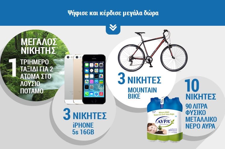 Το ΑΥΡΑ διοργανώνει διαγωνισμό και σας δίνει τη δυνατότητα να κερδίσετε ένα τριήμερο ταξίδι για 2 άτομα στον ποταμό Λούσιο Αρκαδίας (περιλαμβάνονται μεταφορικά ,διαμονή, ημιδιατροφή), 3 ποδήλατα, 3 iphone 5 και 90 λίτρα φυσικό μεταλλικό νερό ΑΥΡΑ σε 10 τυχερούς.