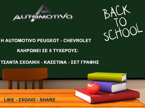 Η Automotivo Peugeot Chevrolet διοργανώνει διαγωνισμό και κληρώνει σε 5 τυχερούς τσάντα – κασετίνα – σετ γραφής εν όψη της νέας σχολικής χρονιάς και σε ένα τυχερό ακόμα δωρεάν αλλαγή λαδιών και τεχνικό έλεγχο 21 σημείων!