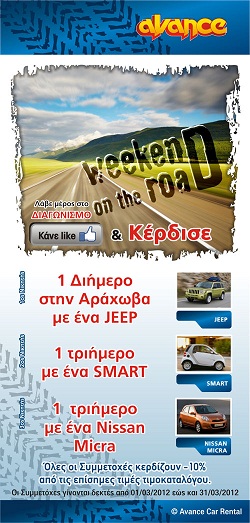 Η σελίδα Avance Greece διοργανώνει διαγωνισμό και σας δίνει τη δυνατότητα να κερδίσετε ένα τριήμερο στην Αράχωβα με ένα Jeep, ένα τριήμερο με ένα Smart και ένα τριήμερο με ένα Nissan Micra.